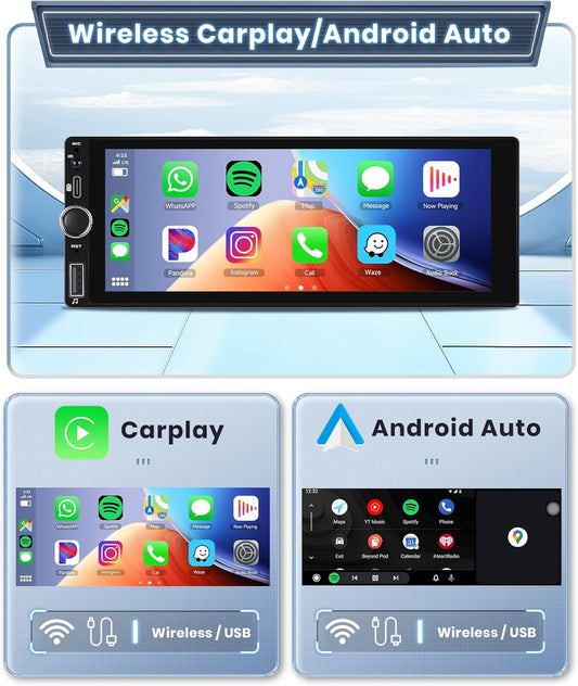 Single Din Car Stereo Wireless Carplay Android Auto 6.86 Inch 1 Din Touch Screen Car Radio Bluetooth FM/RDS EQ Backup Camera USB Type-C SWC AUX in TF